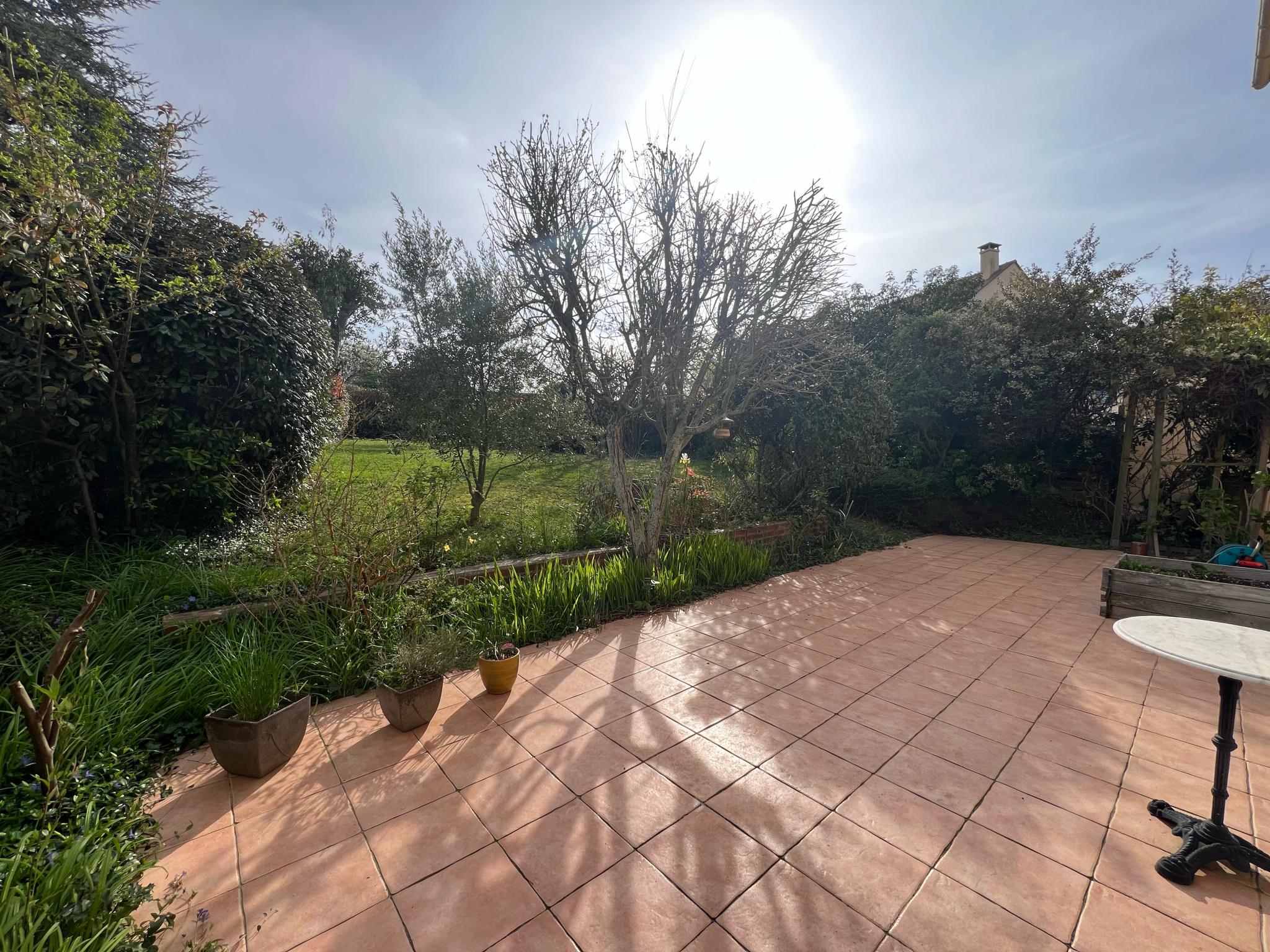 Jardin au calme exposé Sud/Est avec une grande terrasse de 48m² et une allée pavée permettant le stationnement de 2 véhicules.