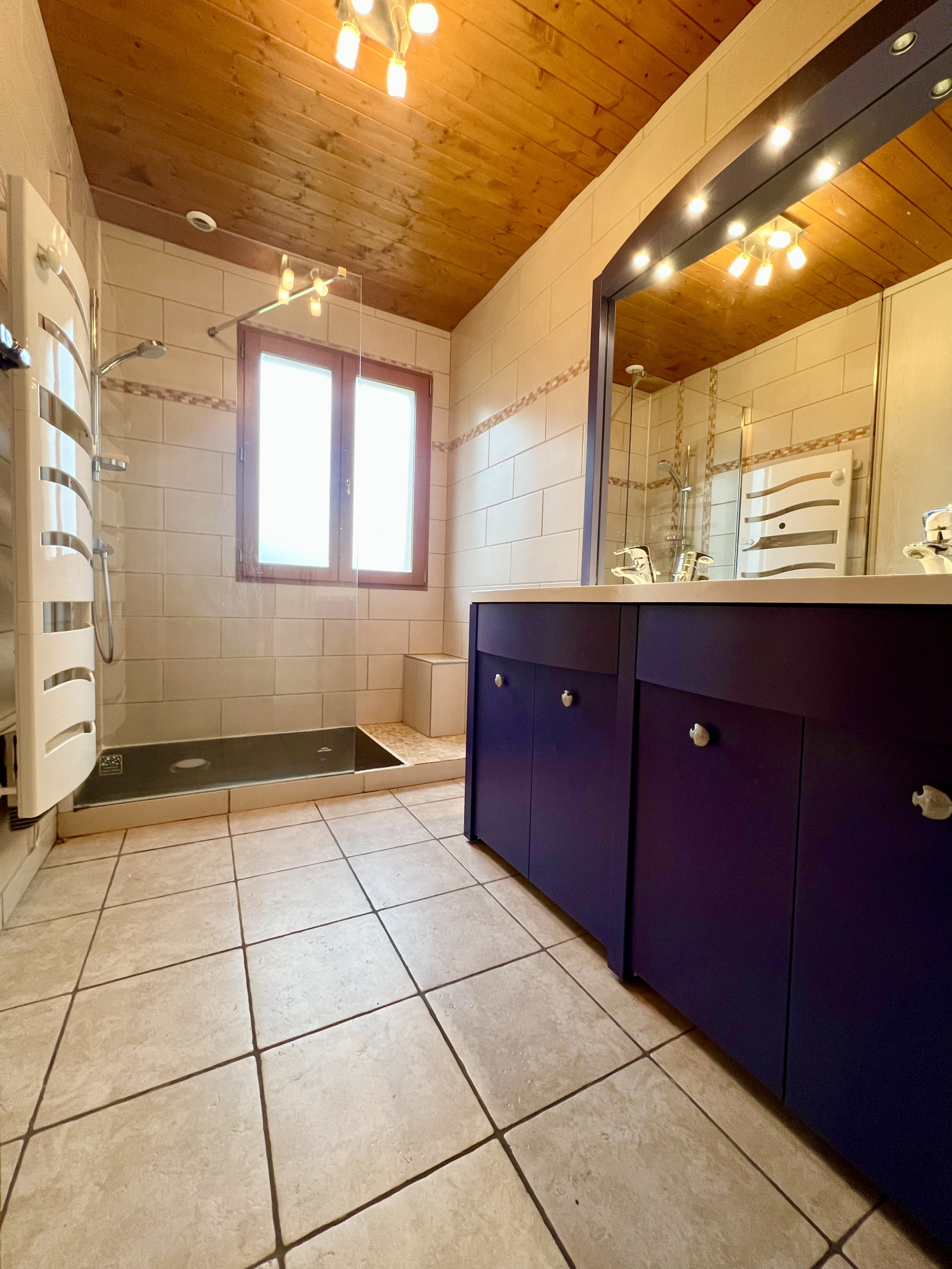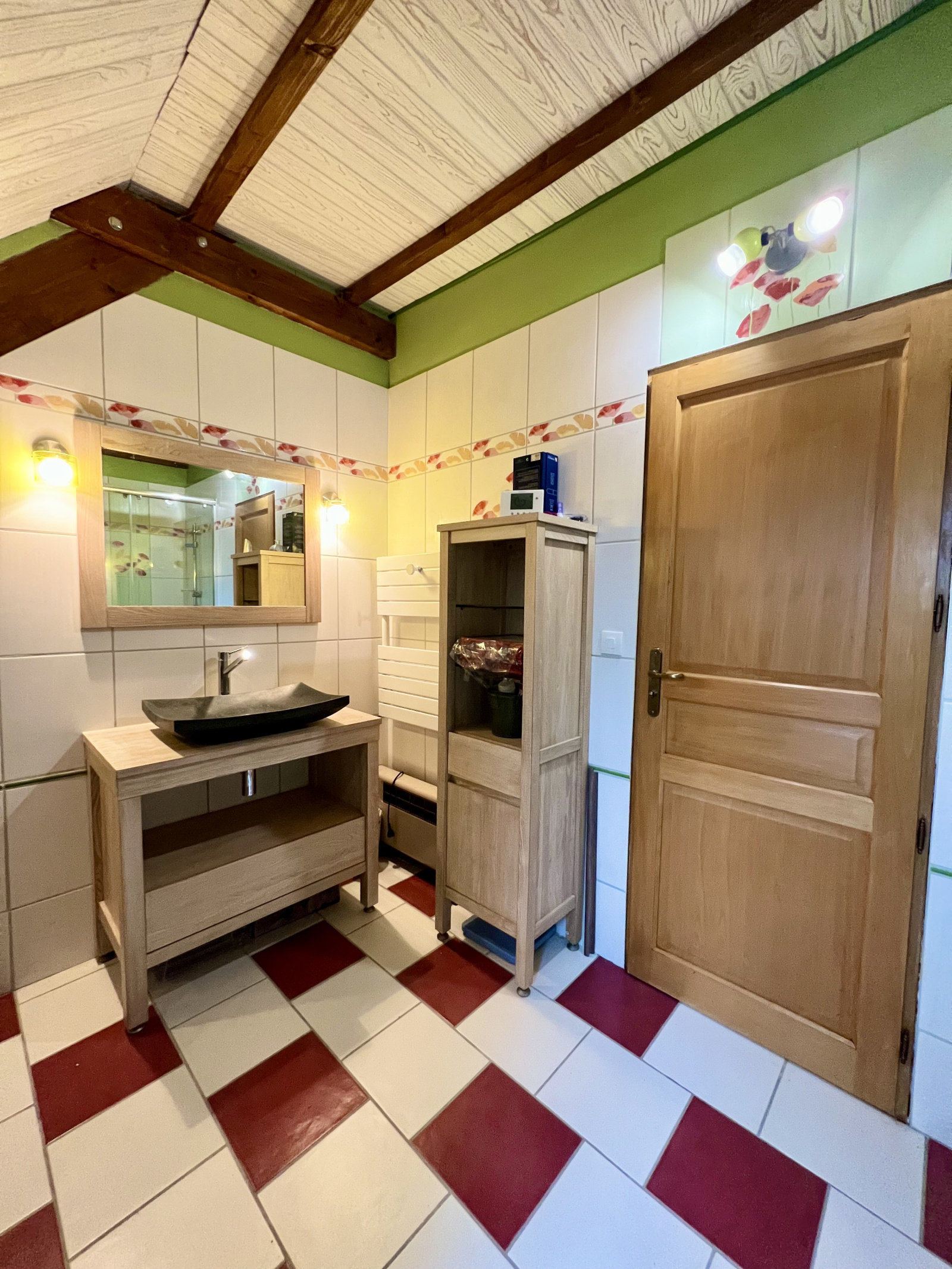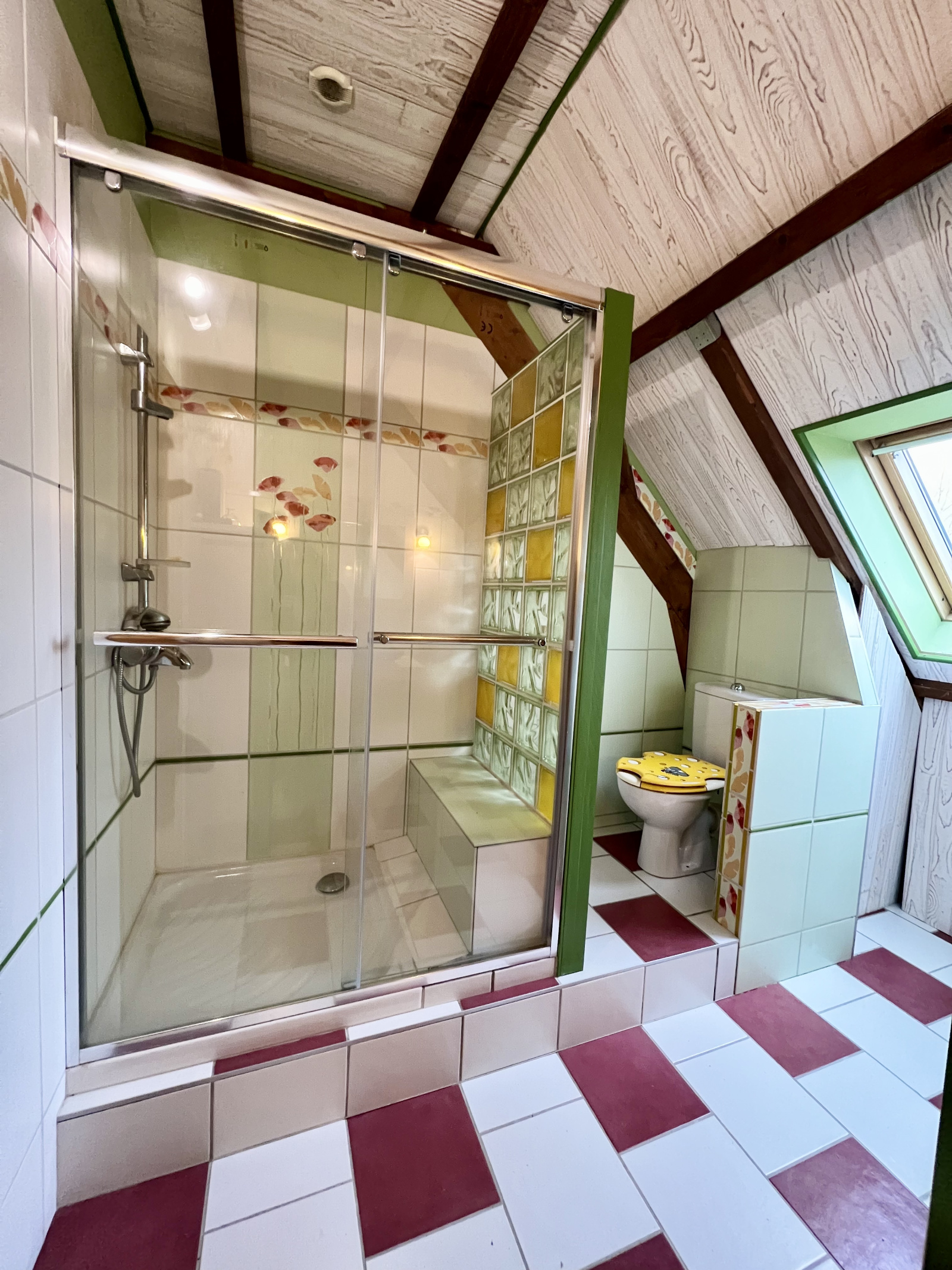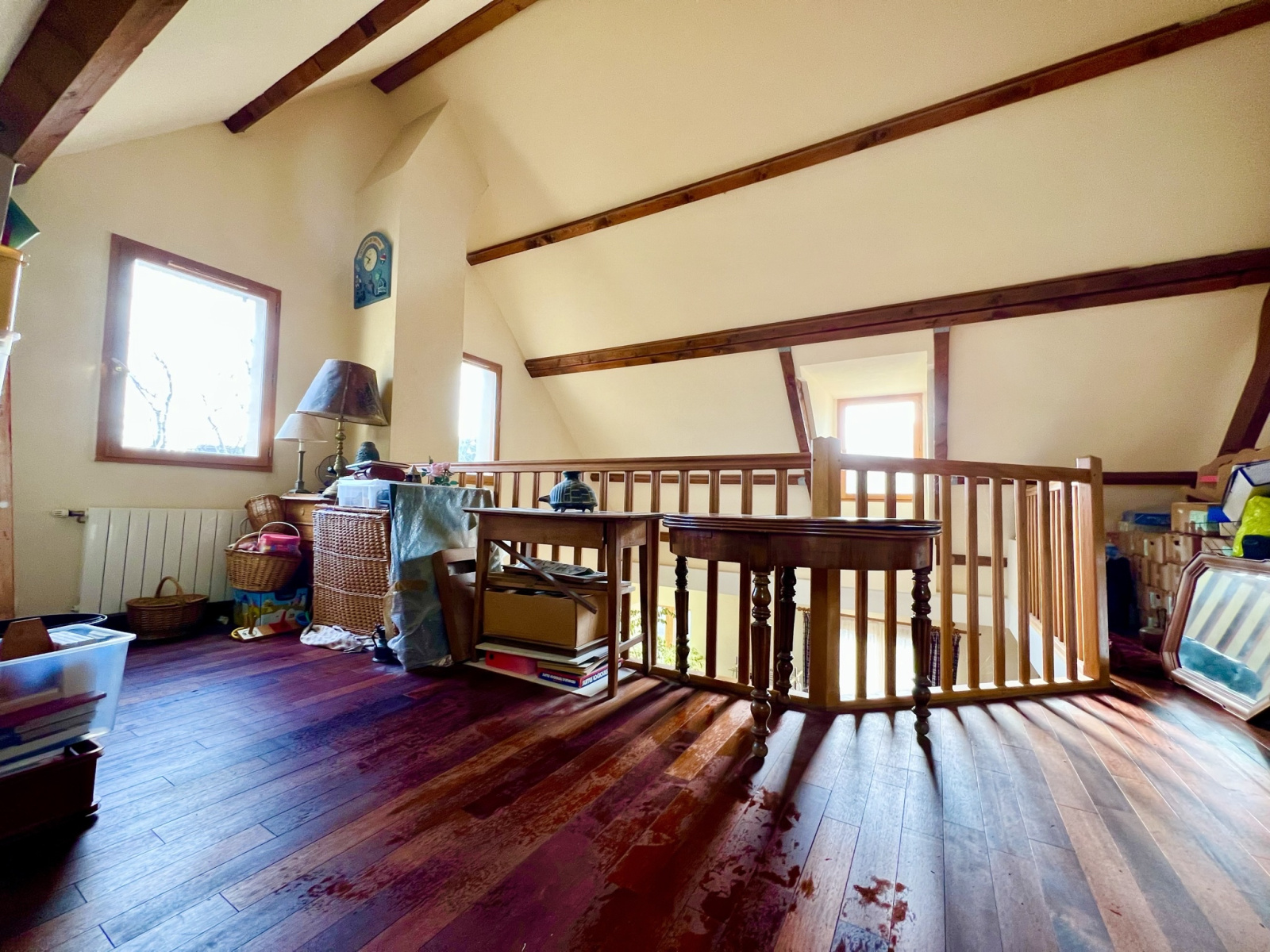 A l'étage, une grande pièce de jeux/bureau en mezzanine, deux chambres, une salle de douche avec WC.