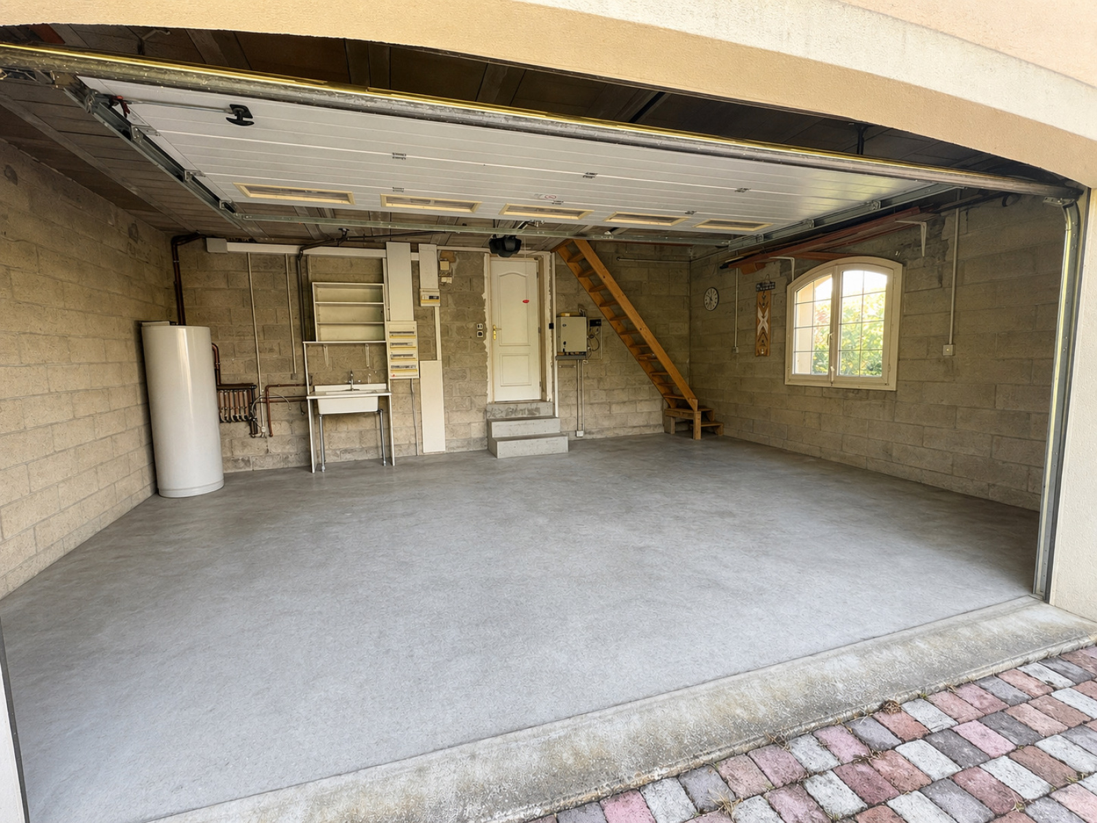 A l'extérieur, un beau jardin paysager, une grande terrasse exposée sud/est, un garage double avec coin buanderie accessible depuis la maison, un cabanon de jardin et un espace potager.