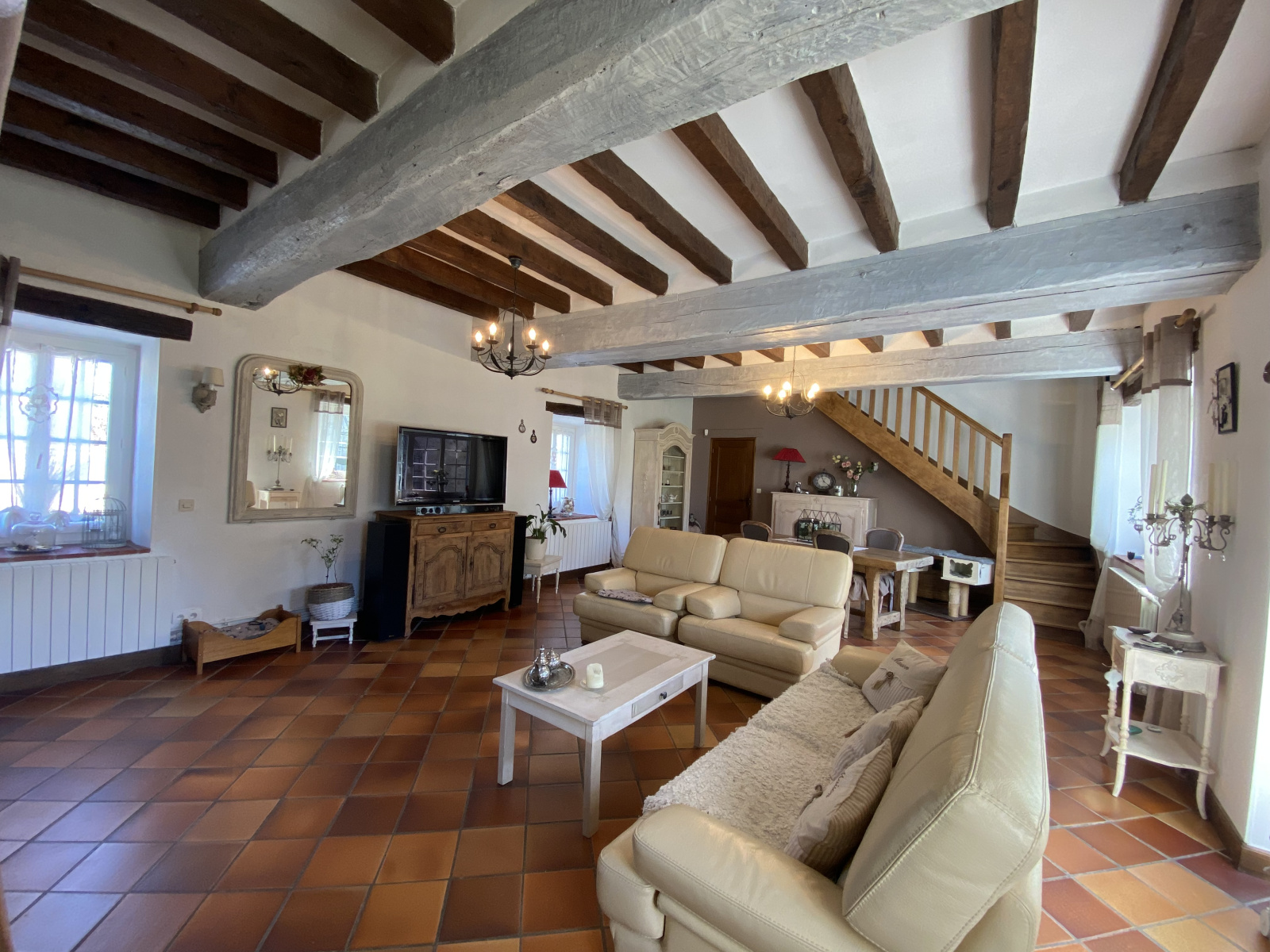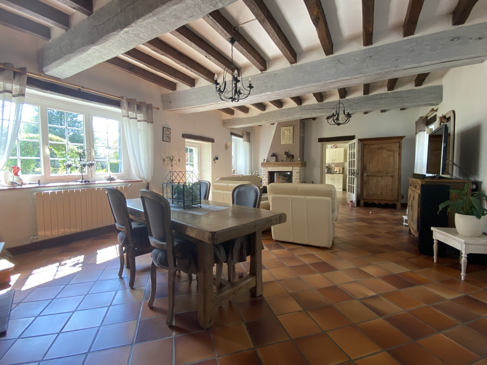 Rez-de-chaussée : entrée, bureau, salon / salle à manger avec poutres apparentes et cheminée avec insert, cuisine dinatoire aménagée et équipée, chambre avec salle de douche et WC, , buanderie, WC indépendant, salle de bains (baignoire, 2 vasques, douche).