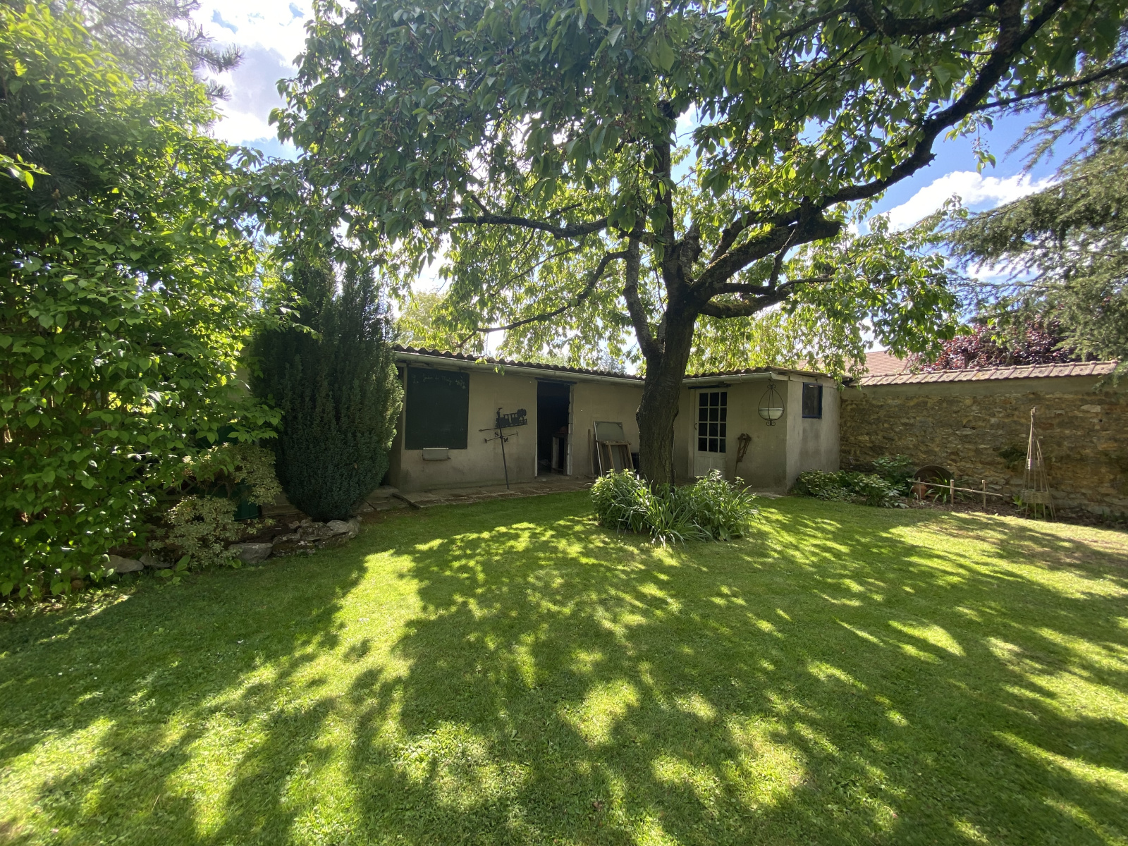 A l'extérieur : 2 garages, un magnifique jardin paysagé et arboré orienté Sud (piscinable), une dépendance de 28 m².