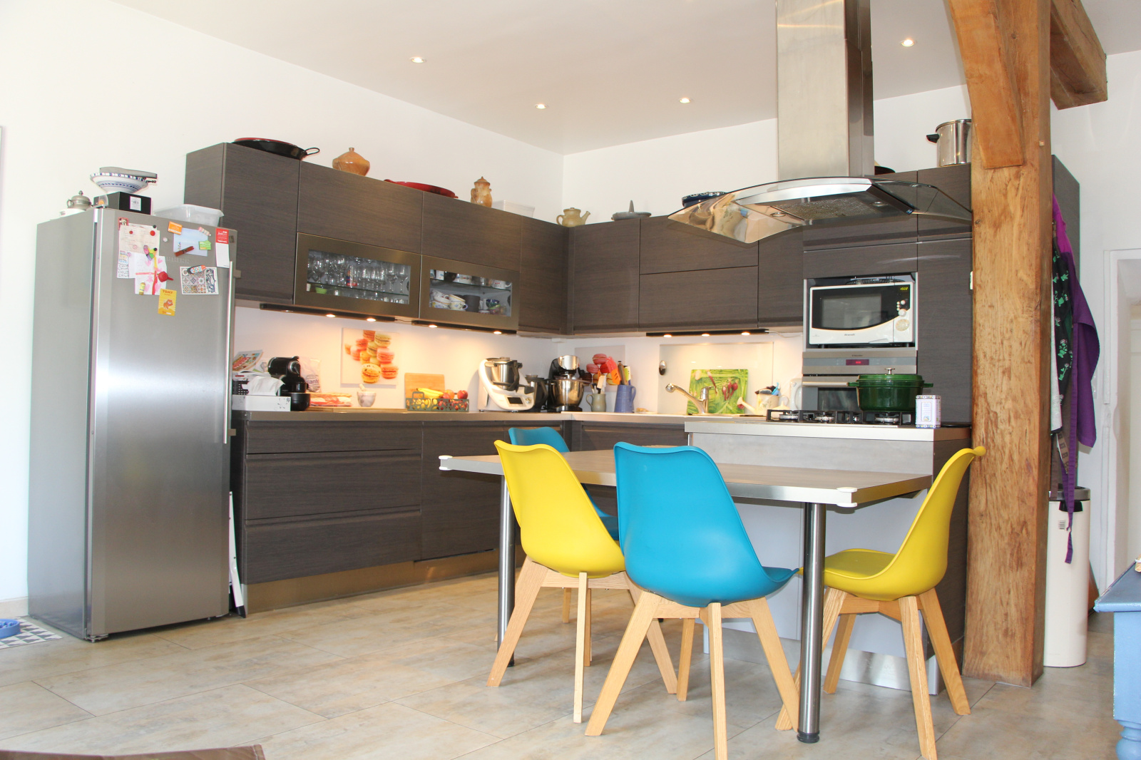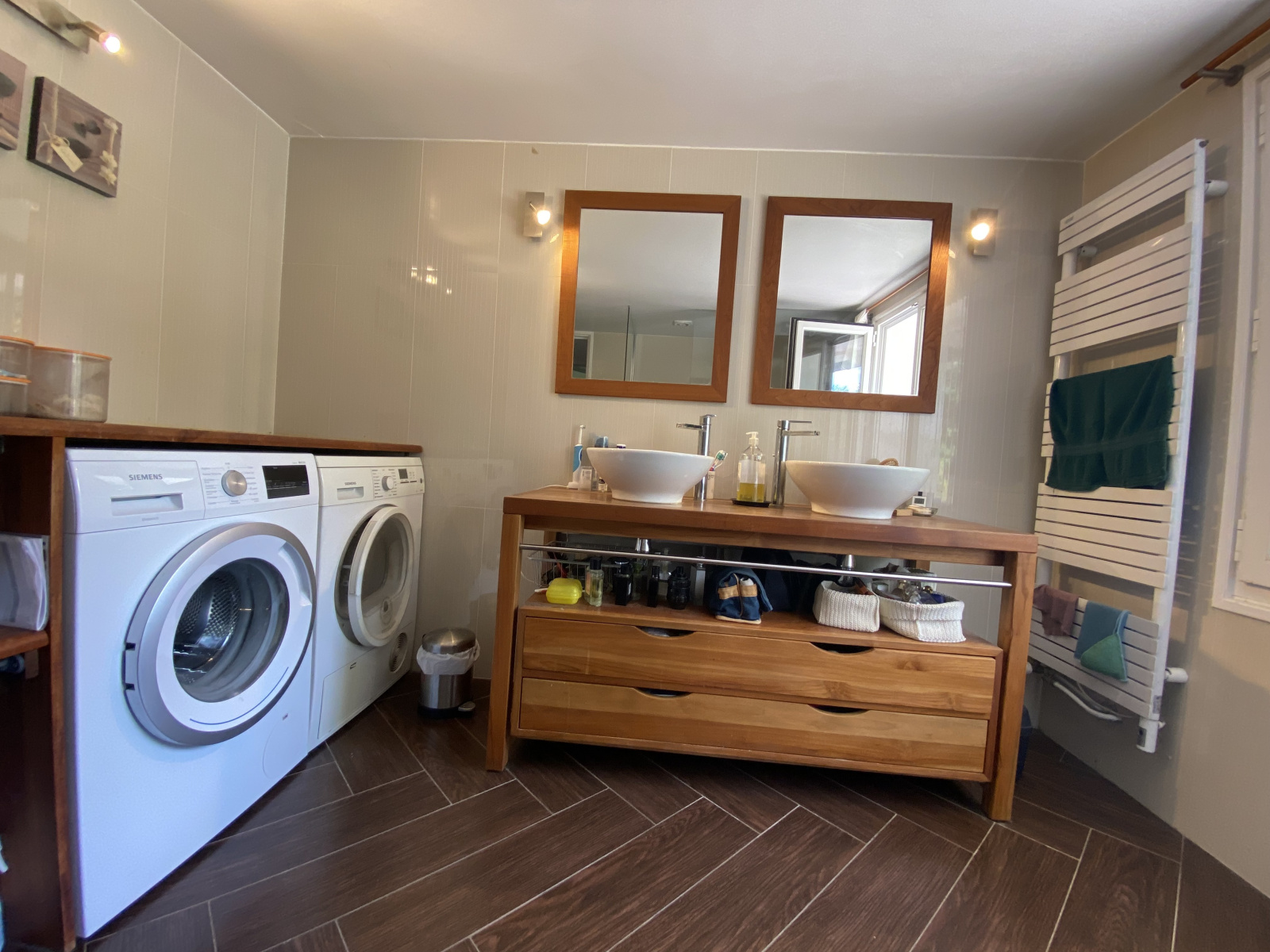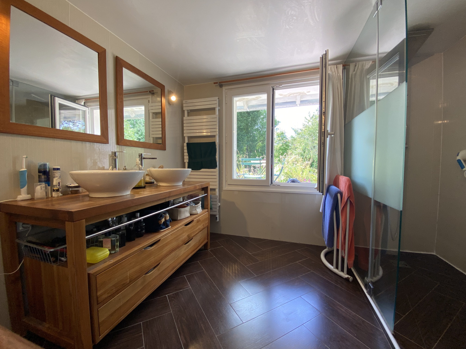 Au RDC : cuisine, double séjour traversant avec cheminée à insert, 2 chambres, salle d'eau (douche à l'italienne, double vasque et emplacement pour 2 machines), WC indépendant, vestibule, chaufferie et grand grenier.