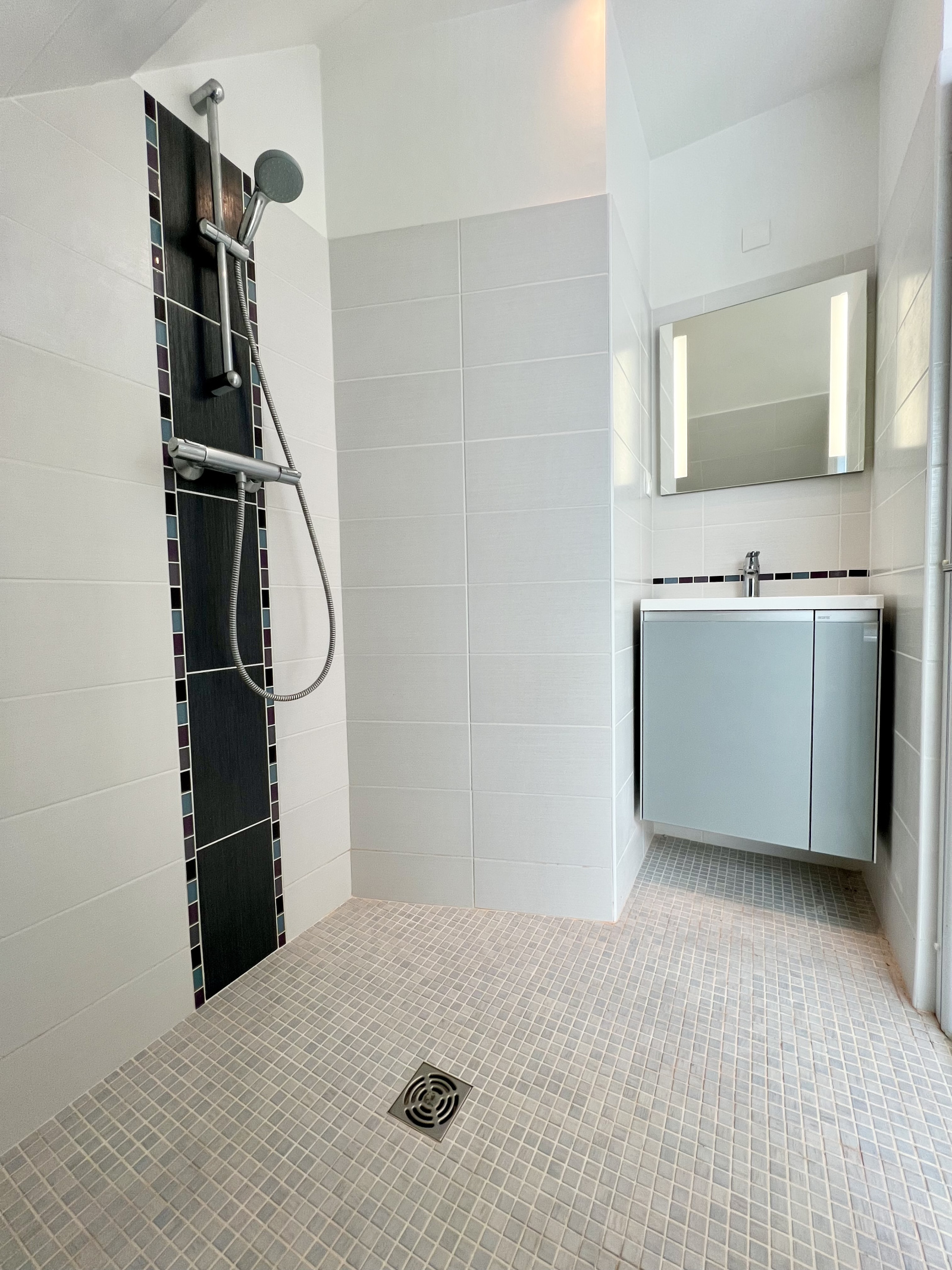 Elle se compose au rdc d'une entrée avec rangements, un grand salon-salle à manger en L à double exposition avec poêle à bois, une cuisine aménagée et équipée avec ilot central et un cellier annexé, une chambre avec salle d'eau et un WC.