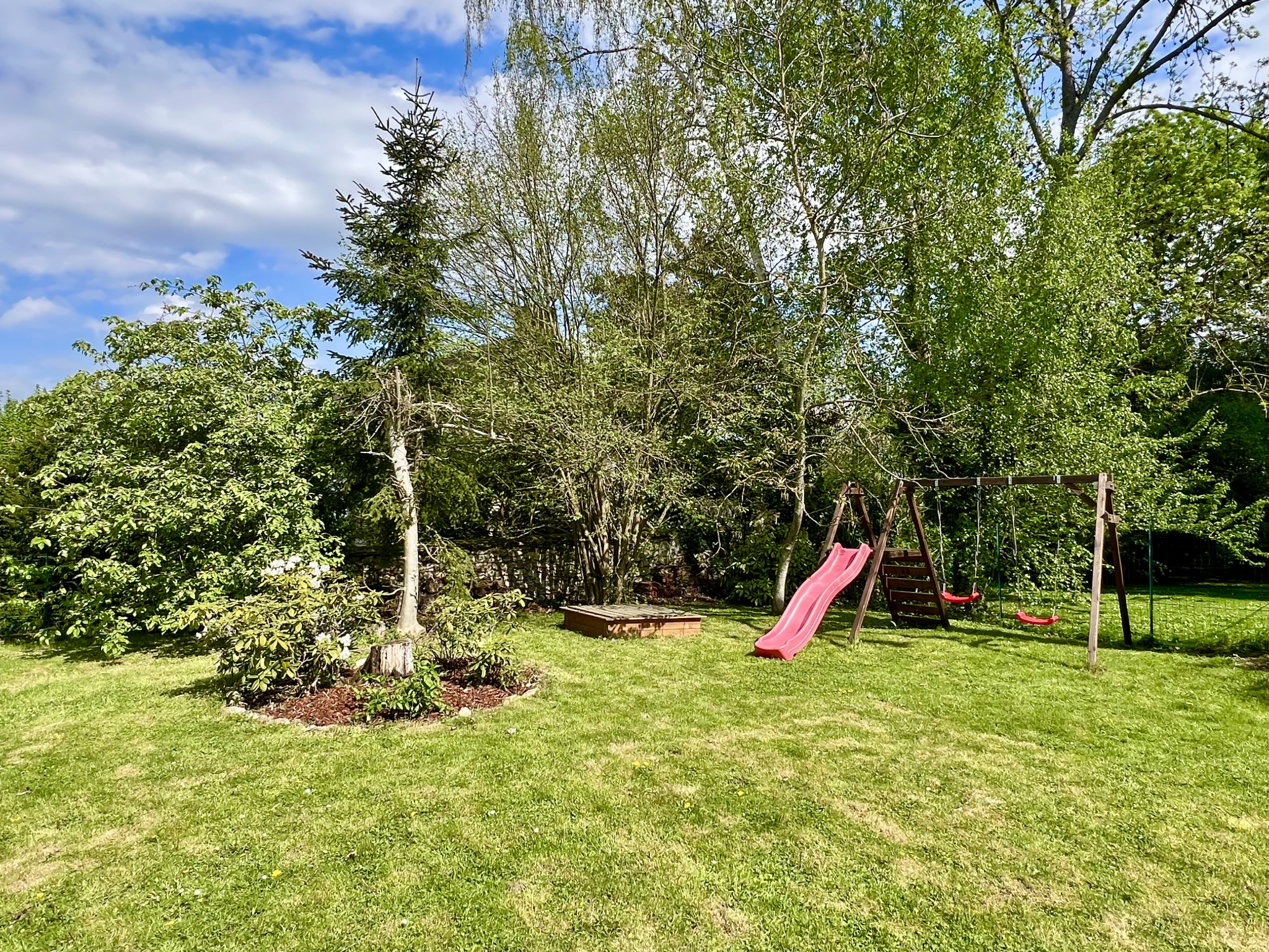 A l'extérieur, un beau jardin paysager, une grande terrasse exposée sud/est, un grand garage avec coin buanderie et accessible depuis la maison, un cabanon de jardin et un espace potager.