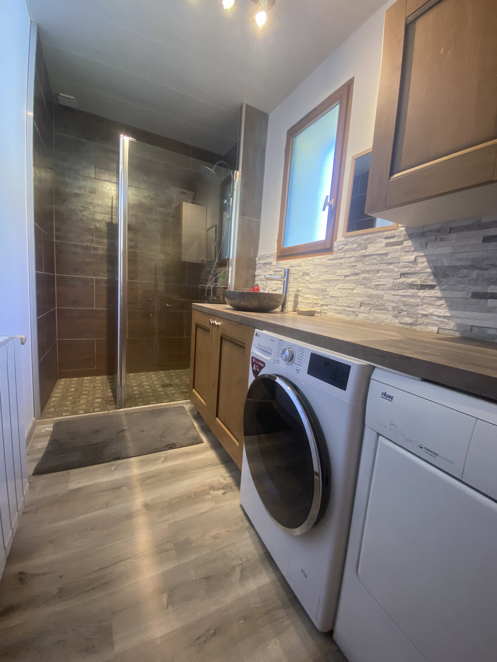 - Au RDC : une entrée avec couloir, une cuisine aménagée et équipée, un séjour/salon avec double accès au jardin, une chambre, une salle de douche avec douche à l'italienne et 2 raccordements de machines, un WC avec lave mains.